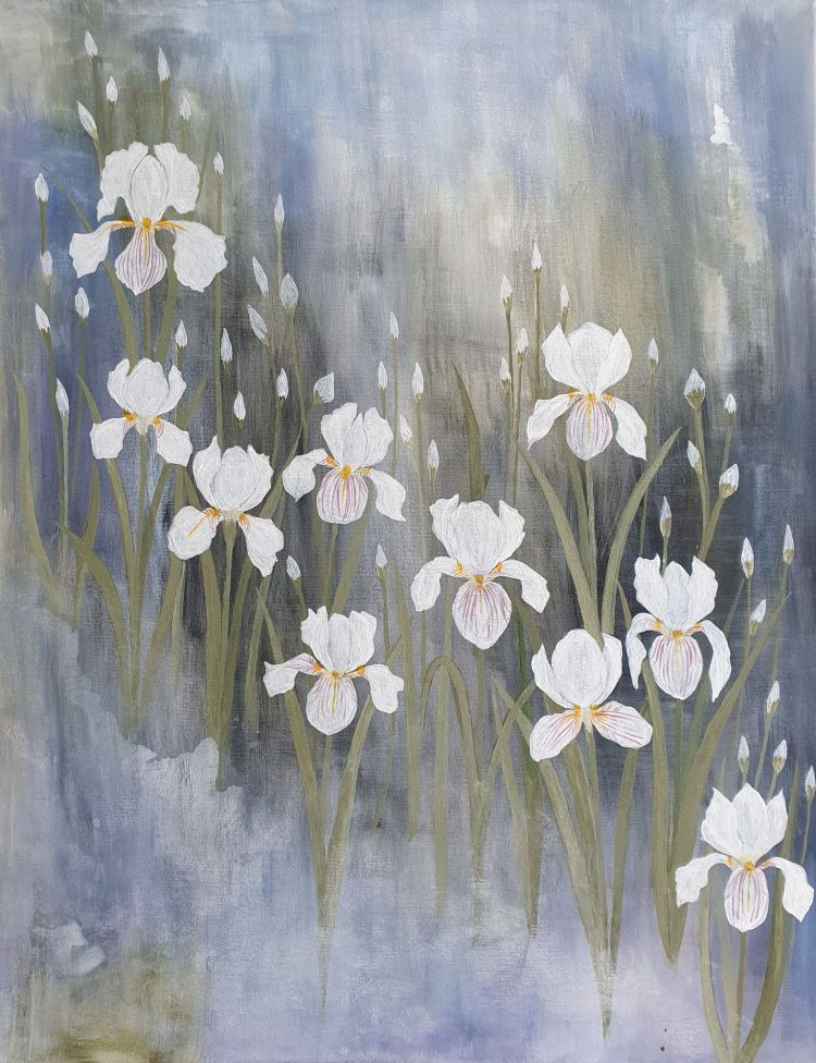 Schwertlilien, 06/2025, Acryl auf Leinwand, 75 x 58 cmIch sehe dich. 08/2025, Acryl auf Leinwand, 40 x 50 cmBaum auf einer Weide, Acryl auf Holz, 40 x 50 cm