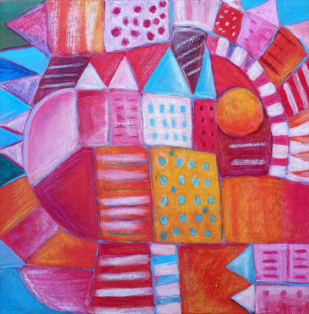 Stadt, 09/2025 Acryl und Ölkreide auf Leinwand, 40 x 40 cmPescaíto, 08/2025, Acryl auf Leinwand, 50 x 40 cmUne histoire de plage, Brigitte Bardot, 08/2025, Acryl auf Leinwand, 40 x 50 cm