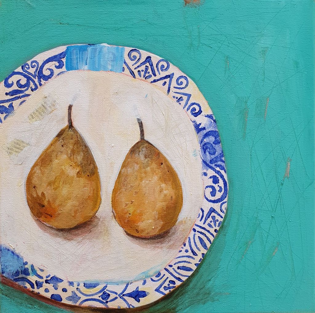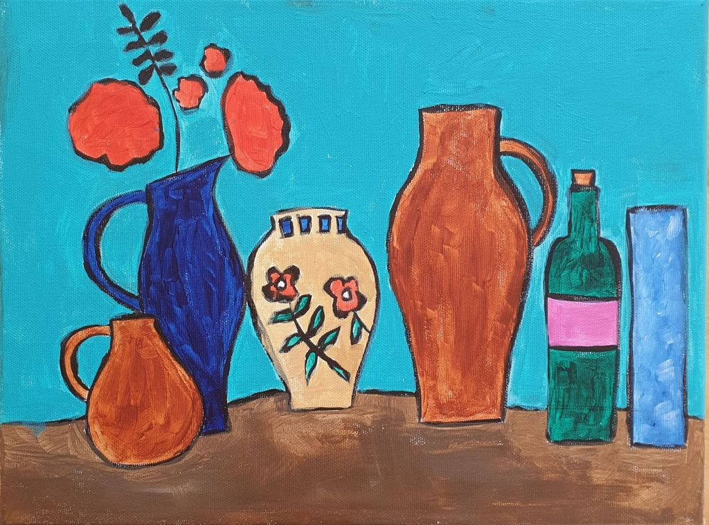 Vase mit Olivenzweig, 2024, Acryl auf Leinwand, 30 x 24 cm